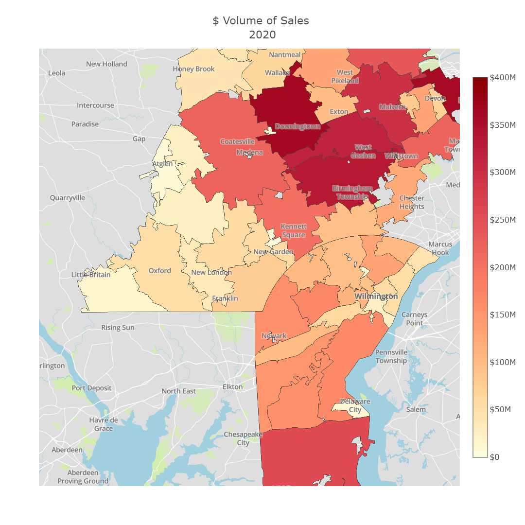 As is often the case, the areas toward Philadelphia had the higher dollar volume of sales. Let's take a look at number of sales and see if that is also higher in those areas.
